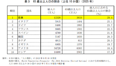 令和7年(2025年)9月時点で、日本の65歳以上の高齢者人口は約3,619万人に達し、総人口の約29.4%を占めています。これは過去最高の高齢化率であり、国民の約3人に1人が高齢者という社会がすでに現実となっています。世界の主要国と比較しても、日本の高齢者割合は突出して高く、他の先進国を大きく引き離す水準です。