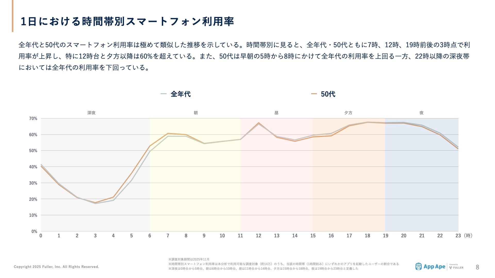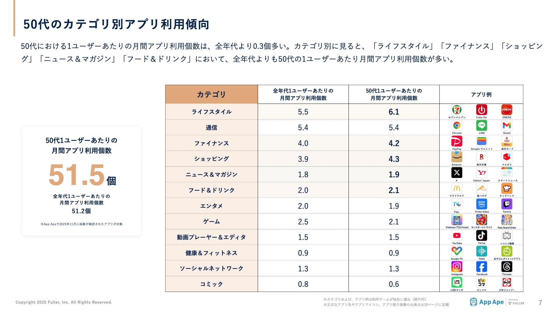 フラー株式会社(本社:新潟県新潟市、代表取締役社長:山崎将司、以下「フラー」)は、アプリ市場分析サービス「App Ape(アップ・エイプ)」に蓄積するデータから、50代(50~59歳)のスマートフォン利用実態をまとめた「年代別アプリ利用動向レポート2025 50代編」を公開しました。