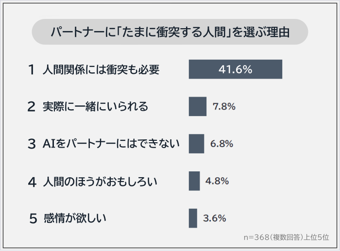 2位は「実際に一緒にいられる(7.8%)」、3位「AIをパートナーにはできない(6.8%)」、4位「人間のほうがおもしろい(4.8%)」、「感情が欲しい(3.6%)」の結果でした。