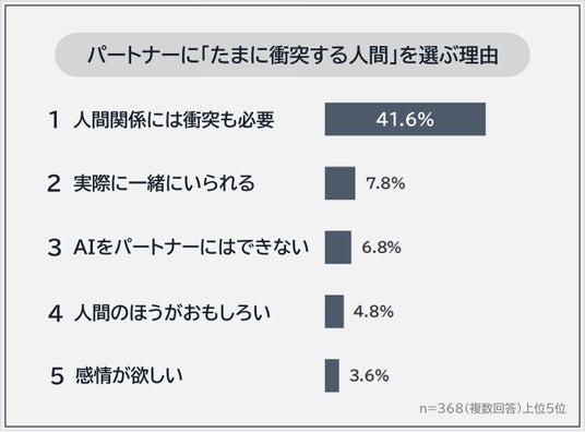 アンケートの結果、完璧に気の合うAIとのパートナーシップは快適でも、「予測できるからこそ面白みに欠ける」「成長につながりにくい」と感じている人も多いとわかりました。衝突や不完全さも含めて人間関係の一部と捉え、衝突による成長を重視している人も多いのですね。