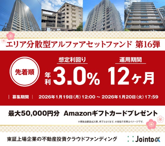 『ジョイントアルファ[Jointo α]』 において、2026年1月19日(月)より募集を開始した第44号ファンド「エリア分散型アルファアセットファンド第十六弾」 の募集が、満額に達し終了したことをお知らせいたします。