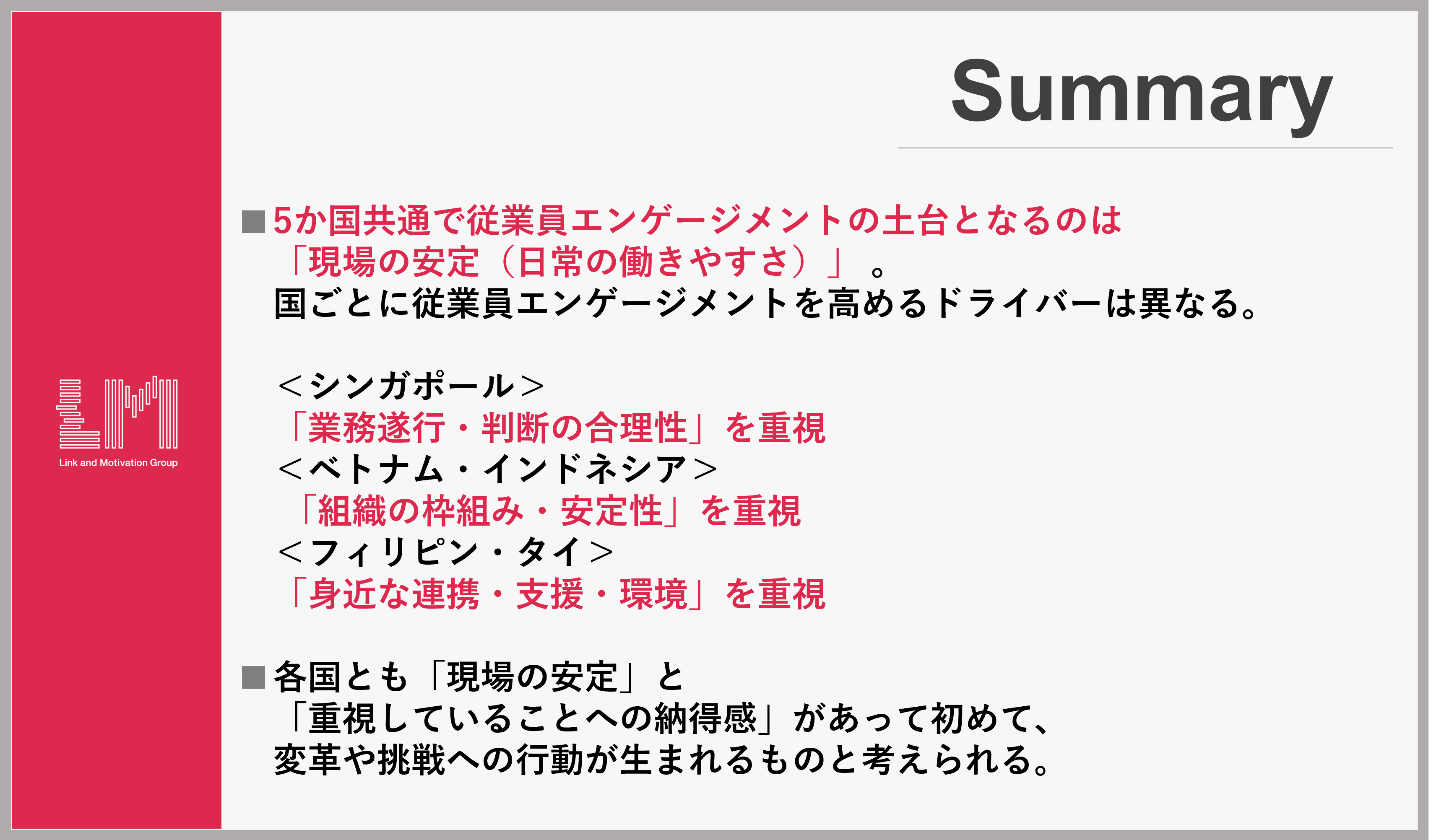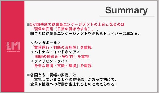株式会社リンクアンドモチベーション(本社:東京都中央区、代表:小笹芳央、証券コード:2170)の研究機関であるモチベーションエンジニアリング研究所は、東南アジア圏の従業員エンゲージメントに関する調査(2025年データ分析)を行いましたので、結果を報告いたします。