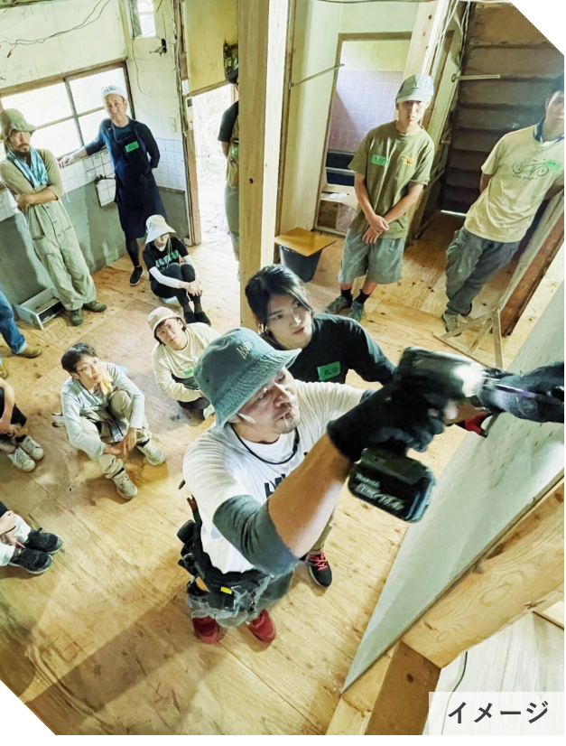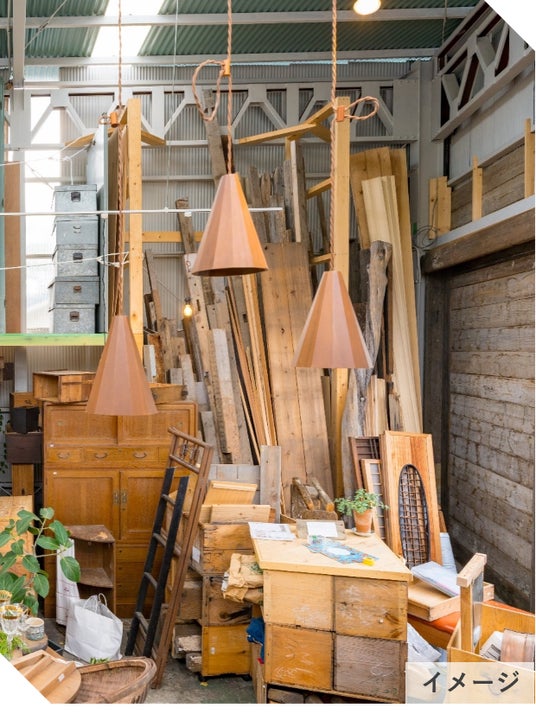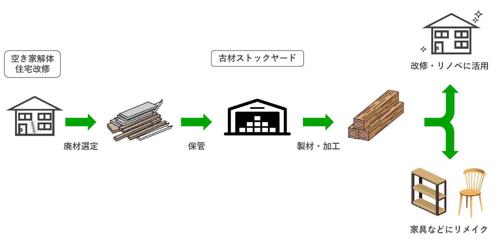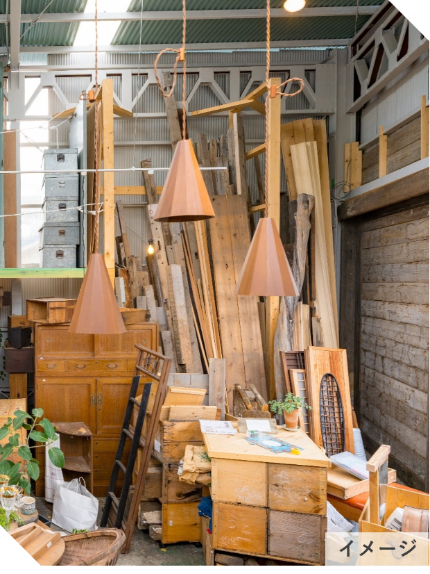 空き家解体等で発生した廃材から活用できるものを古材として保管し、古材ストックヤードにて製材・加工し、空き家改修やリノベーションに活用、家具などにリメイクすることで、古材の活用をはかります。