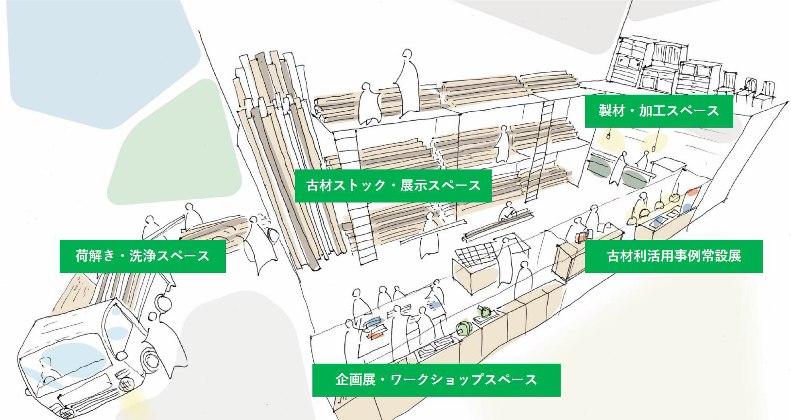・運んできた古材を荷解きし、洗浄するスペース・古材を保全、製材し、保管・展示するスペース