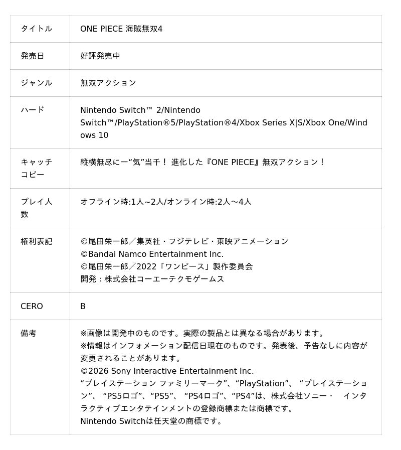 株式会社バンダイナムコエンターテインメントは、Nintendo Switch(TM) 2/Nintendo Switch/PlayStation(R)5/PlayStation(R)4/Xbox Series X|S/Xbox One/Windows 10で発売中の『ONE PIECE 海賊無双4』(開発:株式会社コーエーテクモゲームス)において、エネル、キング、ゼットが収録された追加DLC第8弾「スペシャルセレクションパック」を本日1月22日(木)に発売したことをお知らせいたします。