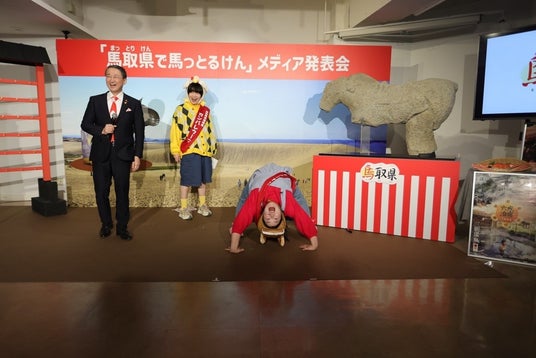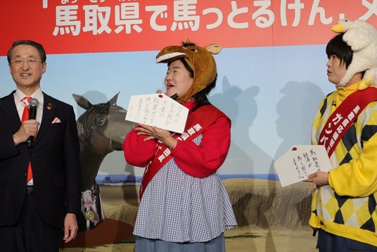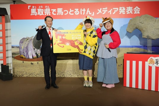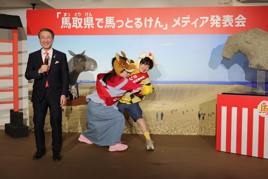 また、馬取県には巨大な馬にも見える鳥取砂丘の「馬の背」、御神馬が祀られている馬の頂「大山」、石製の馬の埴輪として全国で唯一国の重要文化財に指定されている「石馬」といった馬の名所や、馬(ウマ)いもの、馬(ま)んがスポットなどがたくさんあり、鳥取県に安心してどんどんお越しいただきたいという思いを込め、今年1年、「馬取県で馬(待)っとるけん!」とのメッセージを全国に発信していきます。