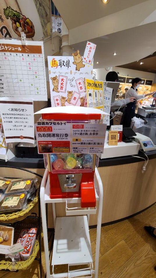 (各日先着30名様)カプセルのなかにはおみくじが入っており、大大吉に当選された方には、石馬見学もできる鳥取開運旅行券をプレゼントいたします。こちらは1日1本限定、3万円相当の特別な景品となっています。そのほかにも、鳥取ならではの食や特産品など、豪華な開運景品をご用意しております。