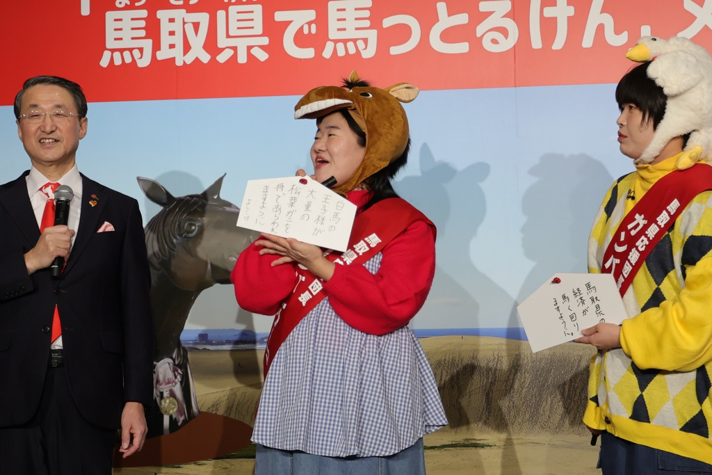 それぞれ馬と鳥の被り物を被ってガンバレルーヤのお二人が登場。午年であるよしこさんは馬に、酉年のまひるさんは鳥に扮し、「馬取県」にぴったりの装いでお越しいただきました。そんなお二人を平井県知事より「馬取県応援団長ガンバレウーマ」に任命。よしこさんはシャレの聞いた大使名に「嬉しい!前回は“蟹バレルーヤ”だったが、色々な名前がもらえて嬉しい。」語りました。まひるさんは「馬取県は、うまい馬(場)所・楽しい馬(場)所なので、ひひ~んと笑ってほしい。」と語りました。続いて、この度期間限定でとっとり・おかやま館に出張する「天神垣神社」の「石馬」に二人が願い事を絵馬に書いて奉納することに。まひるさんは「馬取県の経済が馬くまわりますように。」と故郷鳥取に思いを込めた願い事を書きました。一方のよしこさんは、「白馬の王子様が大量の松葉ガニを持ってあらわれますように。」と欲張った願い事を絵馬に記しました。それに対してまひるさんが「よっちゃん、個人的すぎるよ!」とツッコみ、よしこさんが「クソガ!」と言い返し、取っ組み合いになった勢いで転び、腰を痛めてしまうことに・・・・。