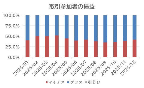 12月のFX取引において実現益を出した投資家の割合は58.1%と、11月の61.2%から3.1%ポイント減少した。実現益を出した口座は5カ月ぶりに6割を下回った。もっとも、2025年を通すと、5月以降実現益を積み上げる口座数が、実現損を計上する口座数を上回っている。