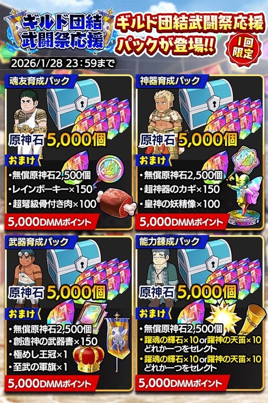 さらに、レインボーキーや超神器のカギ、能力錬成アイテムなどがセットになった「ギルド団結武闘祭応援育成パック」も4種登場!おトクに原神石を購入できるチャンスですのでお見逃しなく。