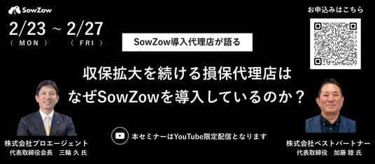 株式会社SowZow(本社:東京都中央区、代表:浅山 裕紀)は、2026年2月23日(月)~2月27日(金)にYoutube限定配信にて損保代理店向けセミナーを開催します。