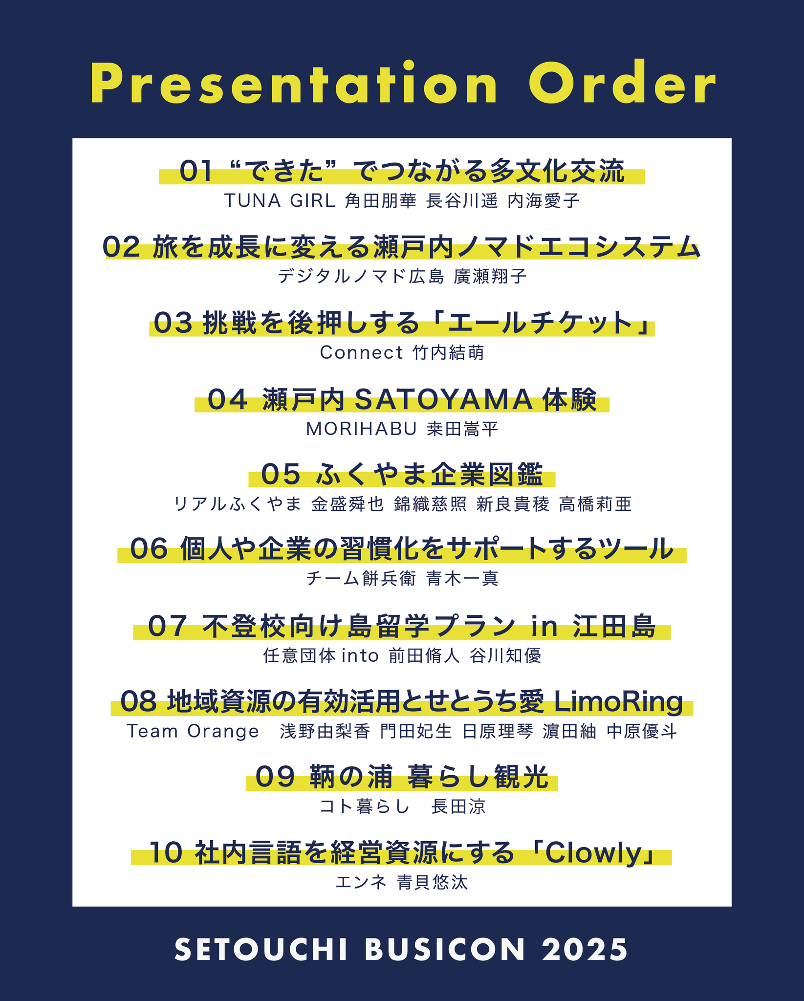 第4回せとうちビジネスコンテスト実行委員会(主催:一般社団法人スタイリィ)は、2026年2月8日(日)にエストパルク(広島県民文化センターふくやま)にて「第4回せとうちビジネスコンテスト」を開催いたします。全国から届いた36チームのエントリーから選ばれたファイナリスト10組が、瀬戸内地域の課題解決に挑むビジネスプランを発表します。今回のファイナリストは学生チームが中心。多文化共生、里山観光、不登校の子どもたちへの居場所づくりなど、若い視点から生まれた多彩なアイデアが揃いました。観覧は無料。当日は来場者投票による「オーディエンス賞」も実施し、投票いただいた方の中から抽選で10名様にオリジナルTシャツをプレゼントいたします。