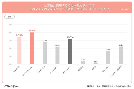 事前調査で「フレグランスを1個以上所有している」と回答した20歳~59歳の女性を対象に「普段、使用することが最も多いフレグランスのタイプ」と尋ねたところ、最も多くの支持を集めたのは「オードパルファム」で20.0%、次いで「パルファム」が17.3%、「ボディミスト」が15.7%と続く結果になりました。