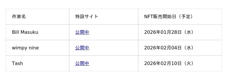 2026年1月28日(水)より、3名の作家によるNFT販売を順次開始いたします。
