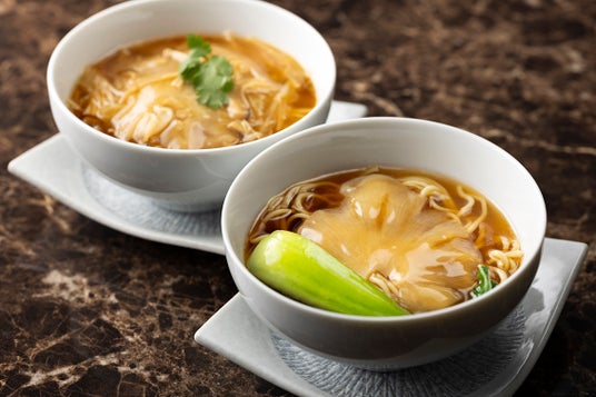 後楽園飯店の人気商品をベースとしたフカヒレメニュー2種を食べ比べでご用意。醤油ベースのスープと中太のストレート麺、フカヒレにそれぞれこだわりの餡をかけて仕上げました。