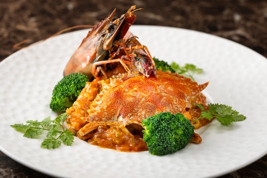 天然で最大級といわれるサイズ感と濃厚な甘み、弾けるような食べ応えが特徴のシータイガーと、噛むほどに広がる強い旨味と甘さが特徴の渡り蟹といった豪華食材を組み合わせたチリソース。海老の味噌と渡り蟹の味噌がソースに溶け込み旨味が凝縮した極上の逸品です。