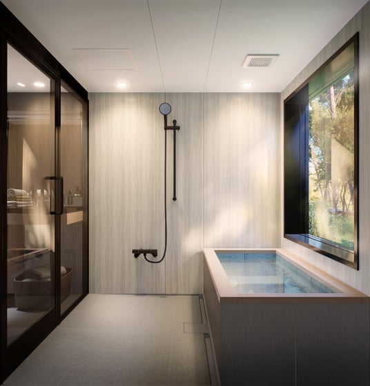 自然素材の浴槽が“ナチュラルウェルネス”な健康志向をサポートするほか、優美繊細な水流や、ご家族それぞれの嗜好で調光できる間接照明により気分に応じた「癒しと寛ぎ」の趣空間を演出し、身もこころもリラクゼーションの彼方へと誘います。