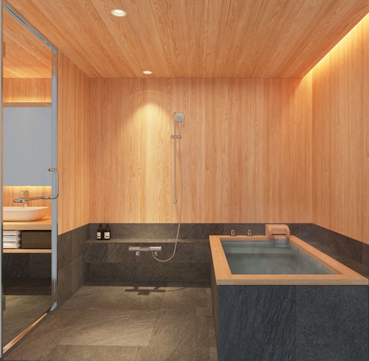 水の音、肌に触れる感覚、広がる湿度、穏やかな光と檜の香り--