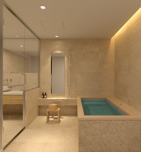 オーバーヘッドシャワーによる包み込まれるような浴び心地に加え、浴槽にはWABUROの象徴である石貼り浴槽を標準装備しています。