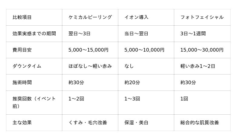 注意すべき点として、イベント直前に初めての施術を受けることはリスクがあります。肌質によっては赤みや軽い皮剥けが生じることがあるため、可能であれば本番の2~3週間前に一度試し、肌の反応を確認してから本番直前に再度施術を受けるという2段階アプローチが最も安心です。