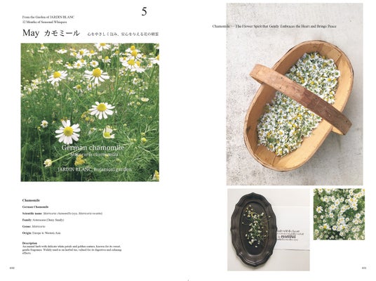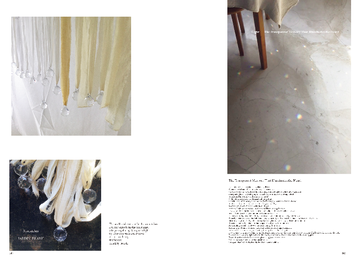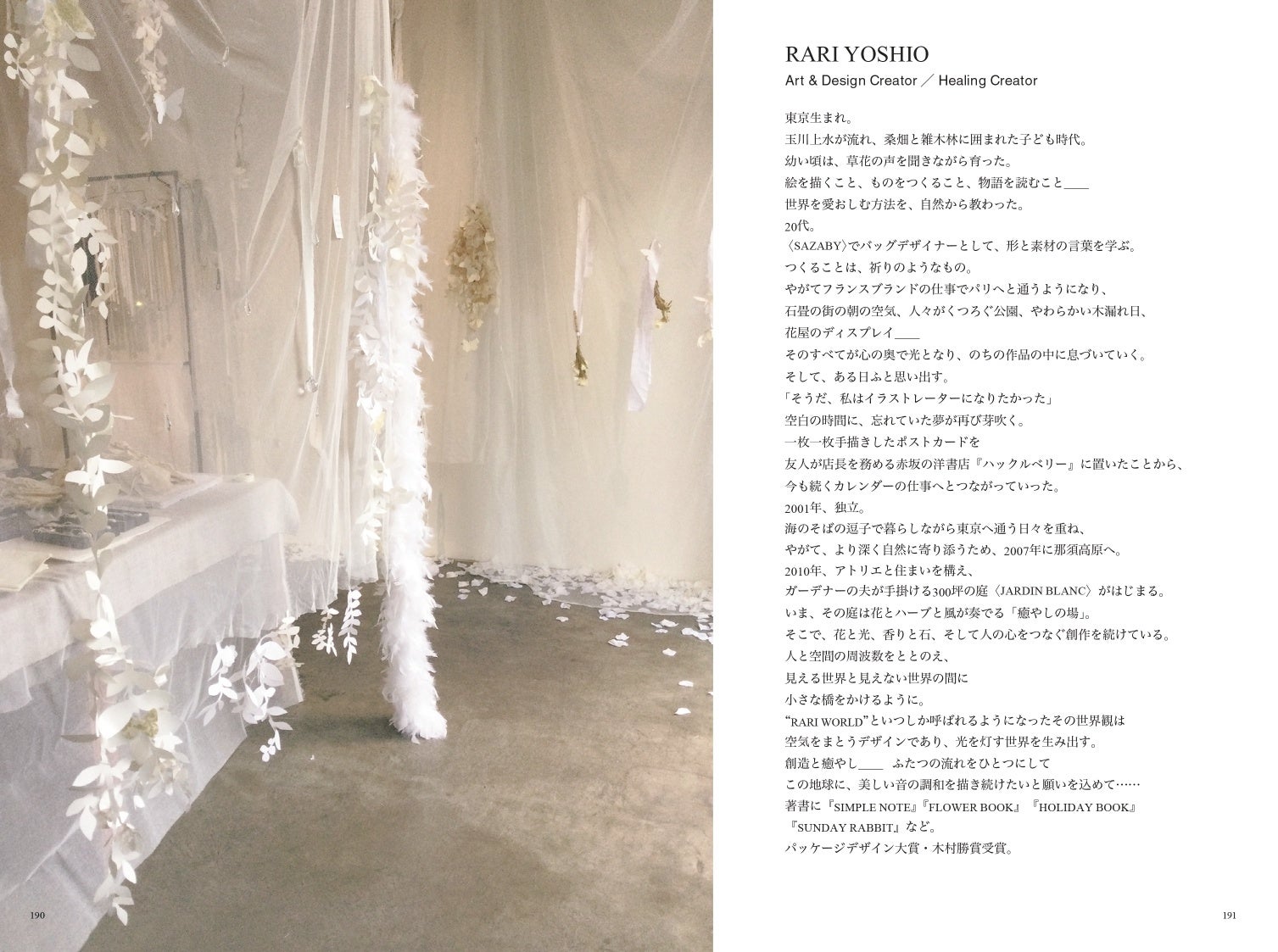 <JALDIN BLANC>を彩る12か月の植物たちに始まり、それらが私たちに与えてくれる癒やしのこと、育むリズム、星や宇宙との連動、そして「今、ここ」にいる私たちへのメッセージ……。あらゆる角度から自然を見つめ、RARIさんが感じる、私たちが私たちらしくいるためのヒントを語っています。