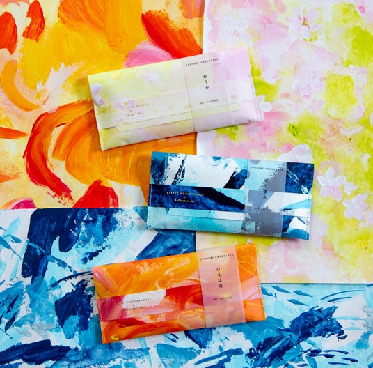 人気の3種類のIRODORI CHOCOLATEのフレーバーをイメージし、アーティストがパッケージに直接絵を描いています。すべて柄の異なる、印刷では再現できない唯一無二のアートピース。チョコレートをお楽しみいただいたあとは、マルチケースとしてご使用いただけます。