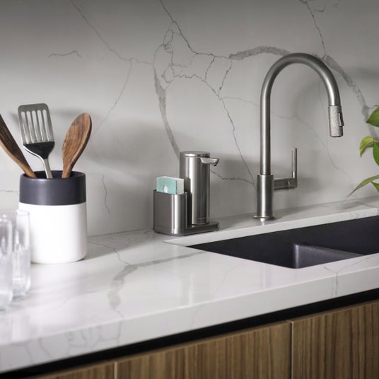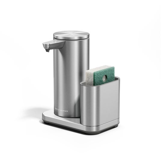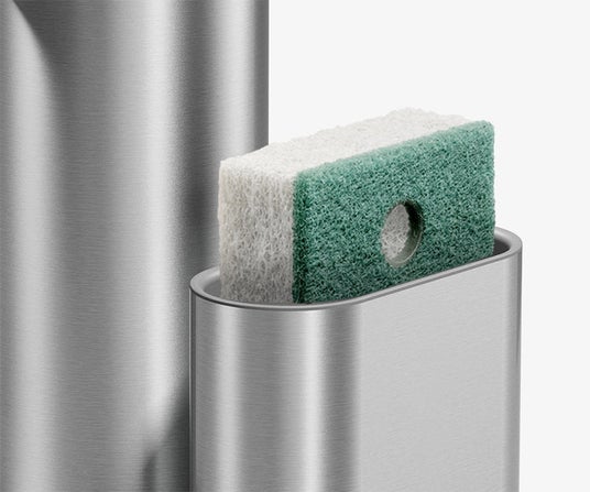 ポンプとスポンジを美しく収める専用キャディを付属。使用頻度の高いアイテムが定位置に収まり、シンク周りが自然と整います。道具が主張しすぎることなく、キッチンに静かに溶け込む佇まいも、simplehumanならではの特徴です。