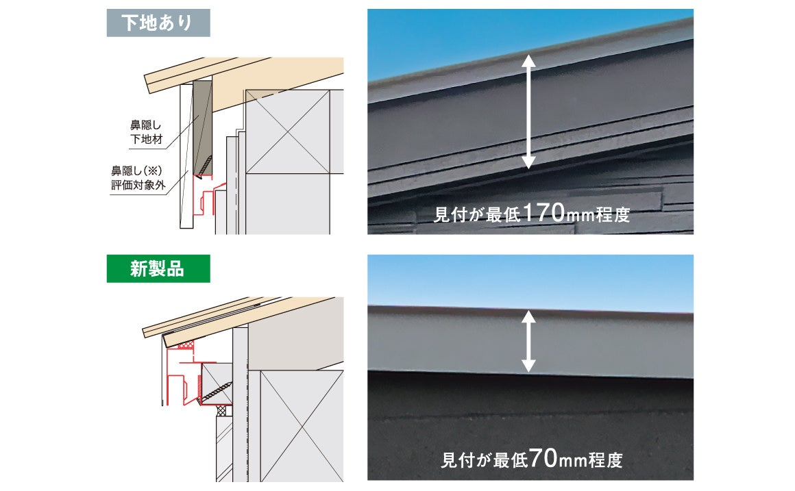 鼻隠し下地不要!従来の約半分の見付でスマートに納められます今までの軒ゼロ換気材を防火認定品として使用するには鼻隠しが必要でしたが、鼻隠しと鼻隠し下地なしでの納まりで防火性能を立証しました。
