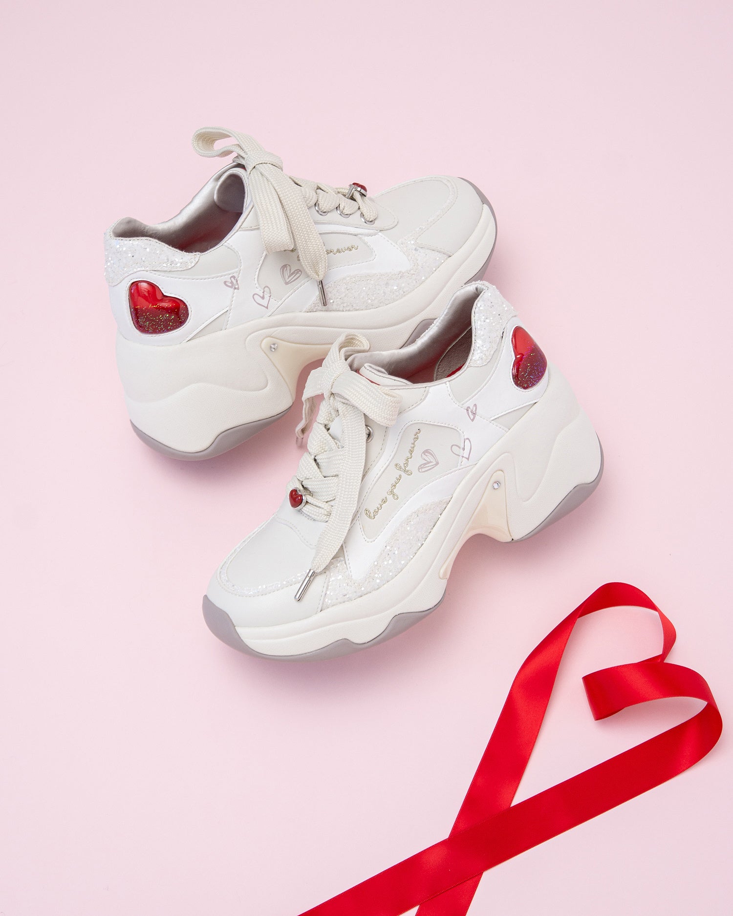 新開発のボリュームソールを採用し、スタイルアップと履きやすさを両立。踵には赤いグリッターがゆっくりと揺れ動く、ぷっくり立体的なハートパーツをセット。アッパーにはラフな手書き風ハートプリントと、「Love you forever」の刺繍で甘さを程よくプラス。+dianaらしい特別感のある1足です。