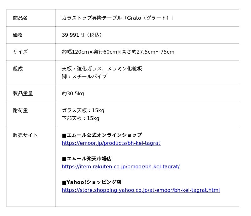 「身体に合った寝る・座る・たたむ」を提供する健康家具ブランドEMOORを展開する株式会社エムール(東京都立川市:代表取締役 高橋 幸司/以下エムール)は、2026年1月22日より ガラストップ昇降テーブル「Grato(以下、グラート)」の販売を開始しました。