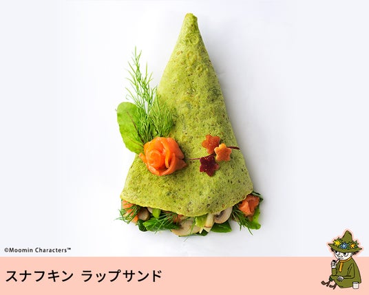 スナフキン ラップサンド北欧のラップサンド「ツンブロート」で作るスナフキンの帽子。ほうれん草パウダー入りの生地で野菜やスモークサーモン、きのこ、りんごを巻いたヘルシーなサンドは朝食やランチにおすすめ。生地はボウルでさっと混ぜてフライパンで焼くだけと手軽に作れます。