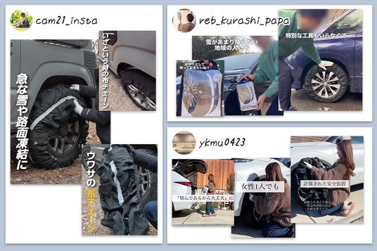 「冬のドライブには欠かせないお守り。トランクにこれがあるだけで安心感が全然違う!」 「金属チェーンは重くて諦めていたけど、これなら私でも数分で装着できました」 「先日の急な雪でいざという時に本当に助かりました!」