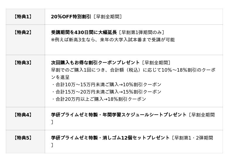 共通テストも終了し、受験まで1年を切りました。難関大を志望する受験生にとって、1日も早く受験生として自覚を持つことが合格の鍵になります。学研プライムゼミの「早割」は、セット講座の受講料20%割引や特別プレゼントなど、各種の特典付き。早く購入するほど特典が充実し、受験勉強のスタートダッシュを応援するお得なキャンペーンです。