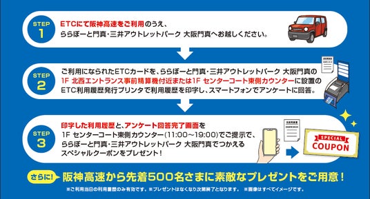 この企画では、阪神高速道路をETCでご利用(※)のうえ、ららぽーと門真・三井アウトレットパーク 大阪門真にご来場いただいたお客さまに、アウトレットショッピングがお得になる「クーポンシート」ならびに「ノベルティグッズ」をプレゼントいたします。(プレゼント条件は下記参加方法を、クーポン利用条件は券面の注意事項をご確認ください)