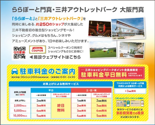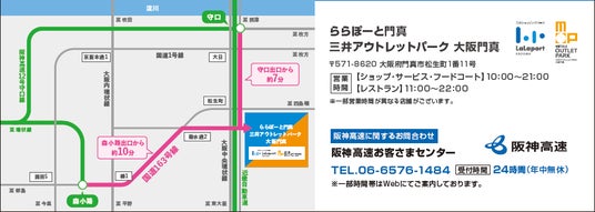 アクセス方法および問い合わせについては、下記またはららぽーと門真・三井アウトレットパーク 大阪門真のサイトをご確認ください。