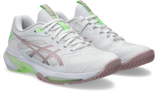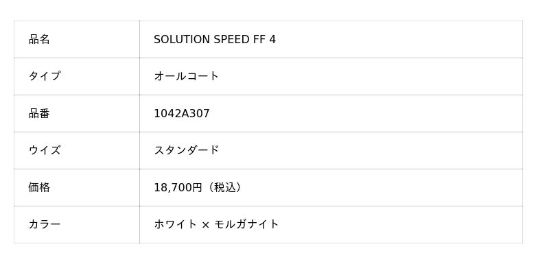 スピードと俊敏性を求めるプレーヤー向けのテニスシューズ「SOLUTION SPEED FF 4」を着用します。トッププレーヤーの意見を取り入れて開発したテニスシューズの最新作です。