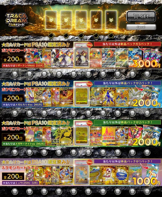 トレカドリームでは、PSA10鑑定済みカードを多数取り揃えているほか、新品パックの展開や、自販機ごとにコンセプトを設定した台などを導入し、何度訪れても楽しめる店舗設計を行っております。取り扱い商品は、ポケモンカードを中心に、ワンピースカード、デュエル・マスターズなど、幅広い人気タイトルを展開しています。
