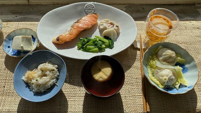 ごぼうの炊き込みご飯、お麩のお吸い物、かぶらずし、菜の花のおひたし、だだちゃ豆腐、小籠包、甘口塩鮭。