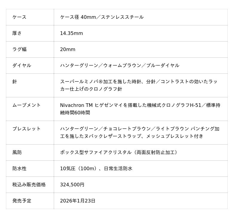 「イントラマティック クロノグラフ H」には、タイムレスな美学を宿すクラシックなシルエットに、現代の技術と機能を融合させています。ディテールにもモータースポーツのインスピレーションを表現。通気性とグリップ性を高めるパンチングレザーストラップ、両面反射防止加工を施したボックス型サファイアクリスタルなど、当時のレーシングカルチャーを思わせる要素が随所に採用されています。そして、汎用性を高めるため、交換可能なメッシュブレスレットが付属し、洗練されたミッドセンチュリーモダン風のスタイルを自在に楽しむことができます。