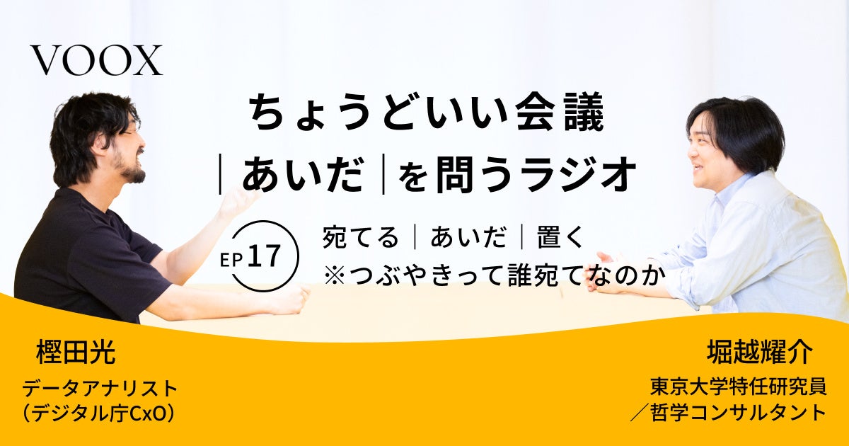 堀越耀介氏(東京大学特任研究員/哲学対話)と樫田光氏(デジタル庁/データ分析)。異なる専門性を持つ二人が世の中の様々な「白か黒か、どちらか一方に割り切れない物事」=“あいだ”について語り合います。何かと何かの“あいだ”を切り口に問いを進めることで予測不能な化学反応を生み出し、聴く人に新たな気づきを与えてくれる。そんな"ちょうどいい"を探求する二人のクロストークをお楽しみください。