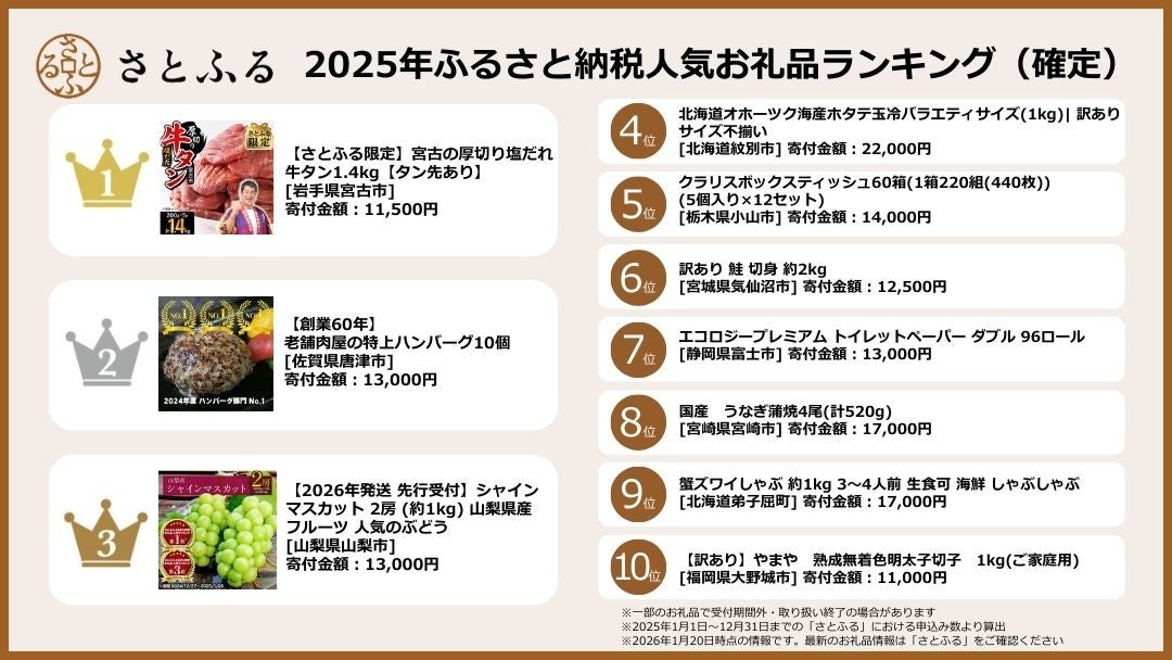 2025年人気お礼品ランキング(確定版)では、6年連続で首位を獲得していた「ホタテ」を抑え、岩手県宮古市の「厚切り塩だれ牛タン」が1位に輝きました。