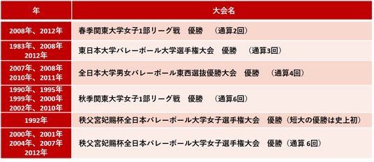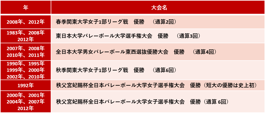 嘉悦大学の女子バレーボール部は、1967年に創部し、これまで大学の各大会において好成績を収め、全国大会である「秩父宮妃賜杯全日本バレーボール大学女子選手権大会(全日本インカレ) 」では、6度の優勝を果たしています。日本代表やSV・Vリーグの選手を多数輩出するなど実績を積み重ねてきました。