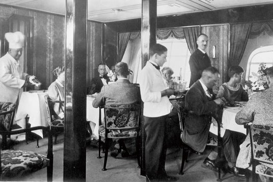 1930年代、当時の航空機では得難かい快適性と滞在性を兼ね備えたツェッペリン飛行船は、人々の憧れを一挙に集める存在でした。乗船していたのは上流階級やビジネスエリート、文化人といった限られた人々。優雅な時間を味わえるよう船内にはラウンジやダイニングが設けられた一方、乗船客にも“空の社交空間”にふさわしい品格が求められ、男性はスリーピーススーツ、女性は気品あるドレスに身を包み、装いもまた旅の重要な要素でした。