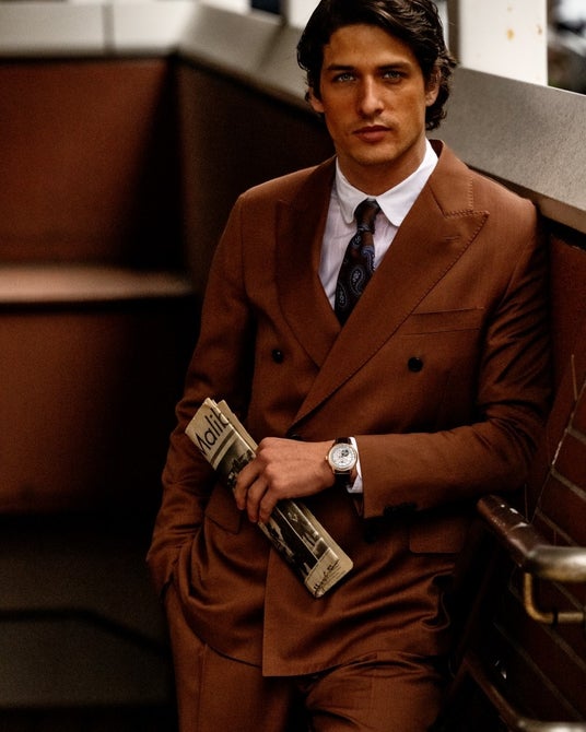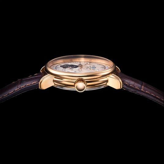 ストラップには、カーフレザーを採用。アイボリー文字盤やゴールドカラーケースと好相性のブラウンカラーで染め上げています。