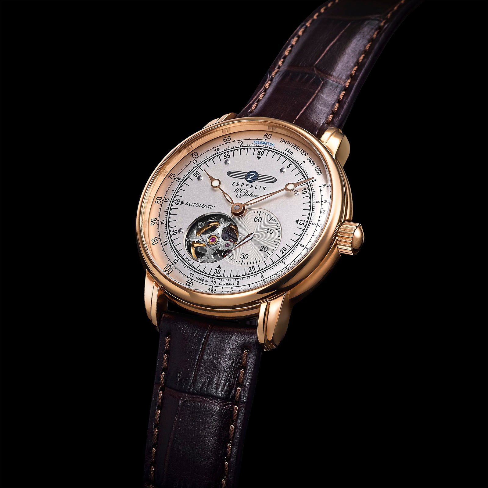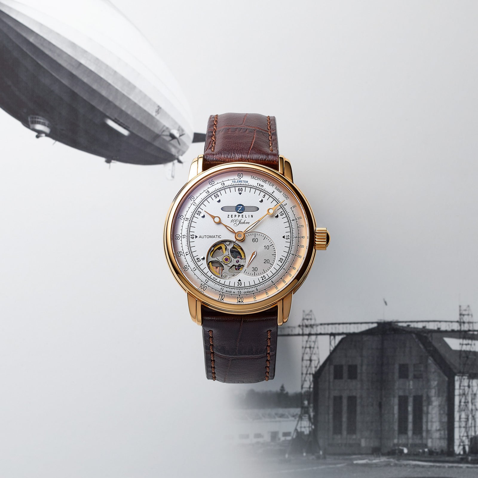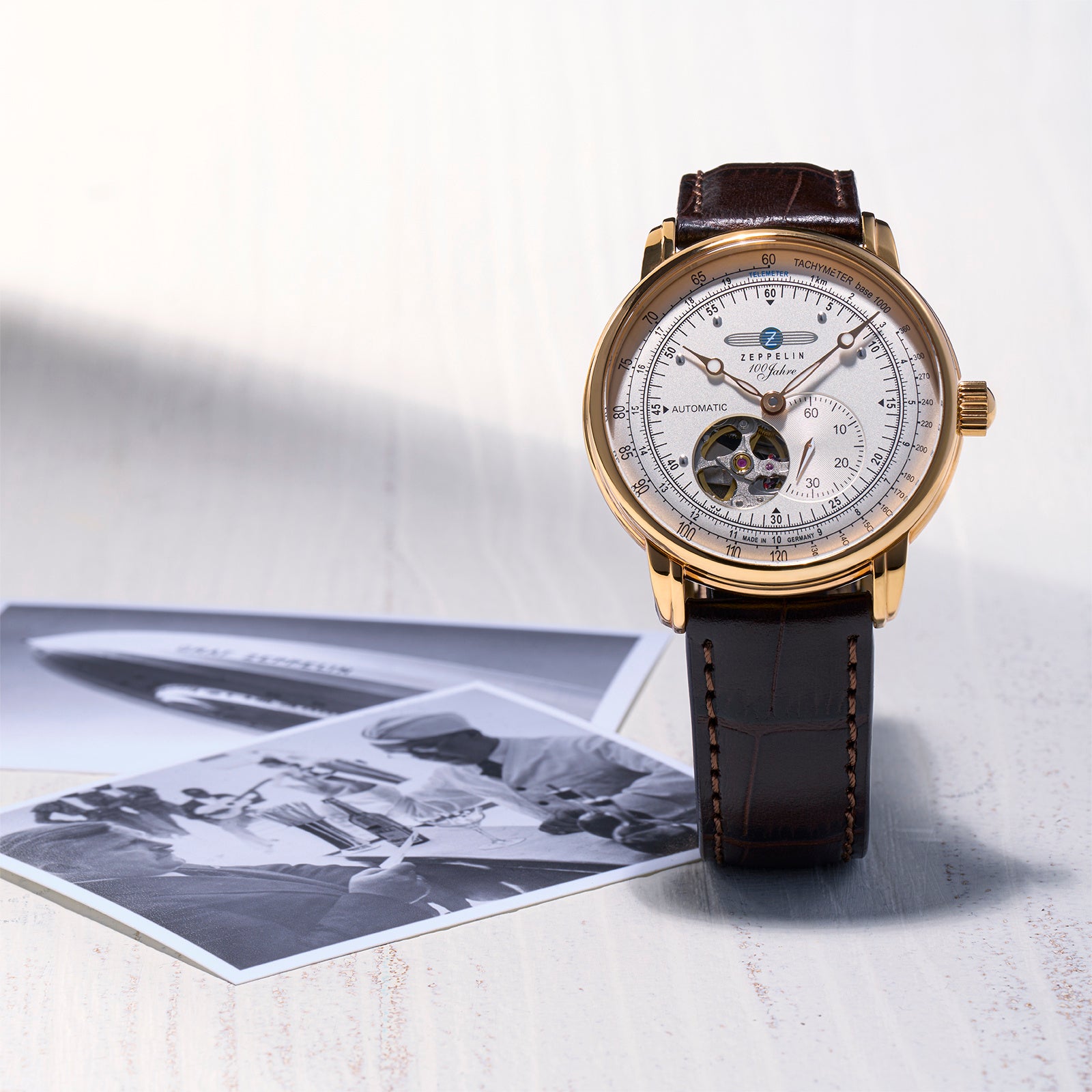 ツェッペリンの新作「100周年記念シリーズ オープンハート オートマティック 7662-8」は、こうした1930年代の空の旅の世界観を表現しました。ゴールドカラーのケースには、かつて空を旅した人々の品格と、時代を超えて受け継がれるクラシックな美意識が息づいています。