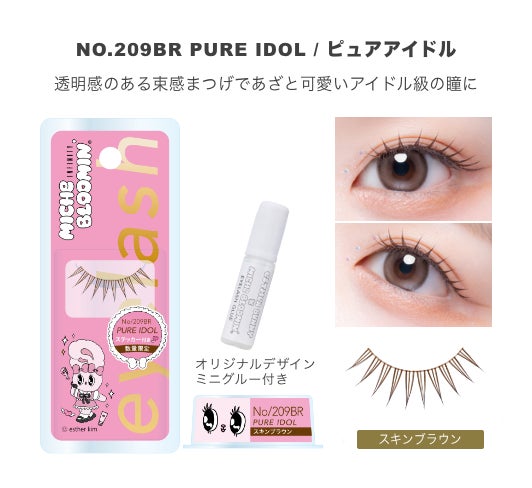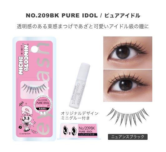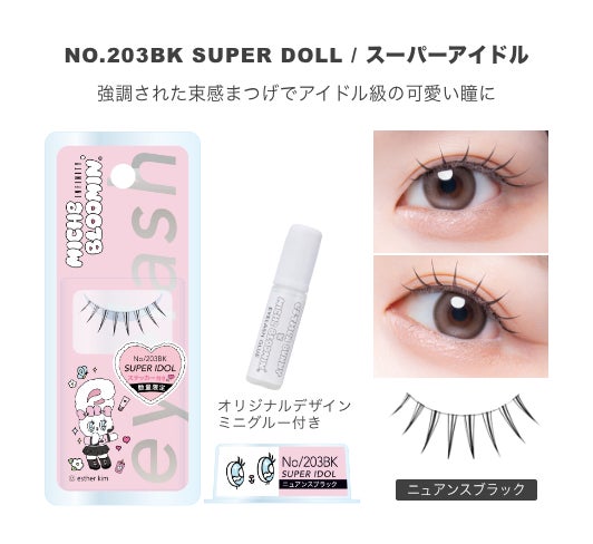 今回のコラボレーションでは、ブランド屈指の人気を誇る束感まつげ「NO.203 SUPER IDOL」と「NO.209 PURE IDOL」をセレクトいたしました 。エスターバニー自身が実際につけまつげを着用して、最高にキュートな“アイドル風”に変身した描き下ろし限定パッケージが登場します。