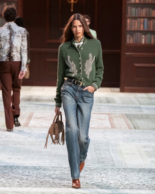 メンズのフォーマルウェアには気取らない気ままさと、個性が加えられています。アーティストのハイブリッドなワードローブに着想を得たテーラリングは、昼はドレスアップ、夜はデニムと気軽に着こなされます。洋服はパーソナリティを思い起こさせる存在となります。これは単なるカジュアル化ではなく、日常に「特別な瞬間」をもたらす感覚です。デニムには豪華なベルベットのフロッキー加工が施され、刺繍が句読点のようにアクセントを添えます。ボーイフレンドスーツは彼女が着こなし、繊細な刺繍ニットは彼女のワードローブから彼の元へ - それは“生きた日常”の表現です。長く着古され愛されてきたような風合い。そこには時を超えた、永続的な感覚があります。