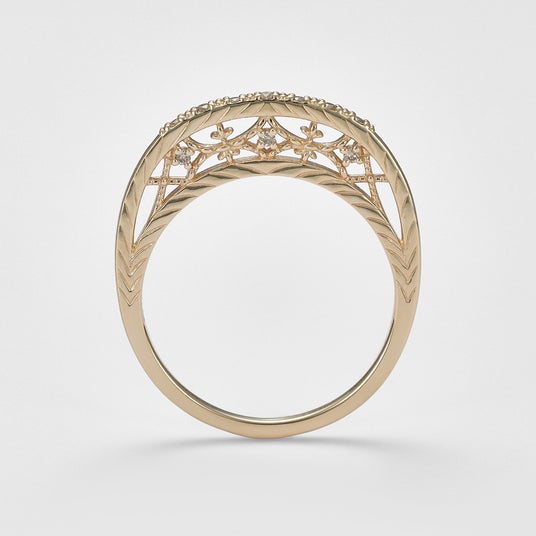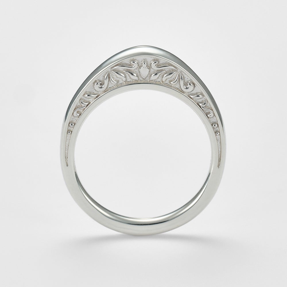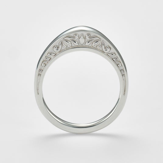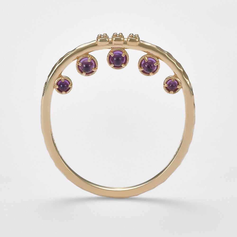 リングに高さを持たせたシリーズは、側面のデザイン性がポイント。鮮やかなアメジストや繊細な透かし模様が、手を動かす度にチラ見えしてどこから見ても楽しめるデザイン。正面からのデザインはすっきりとしたストレートシルエットなので、他のリングとの合わせやすさも抜群。