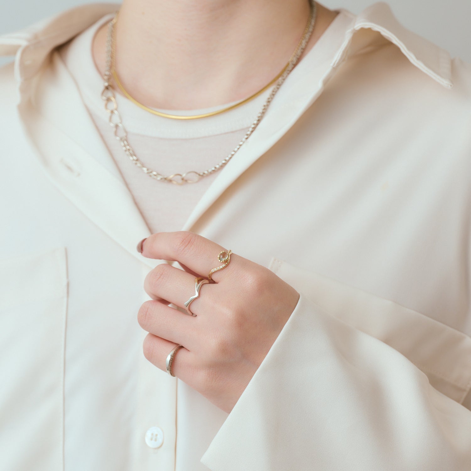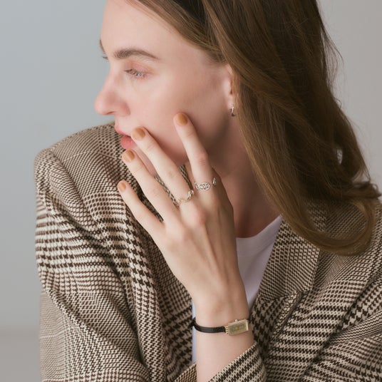さらに他のリングと重ね着けをすることで心地よい隙間が生まれ、モダンで洗練された印象に。
