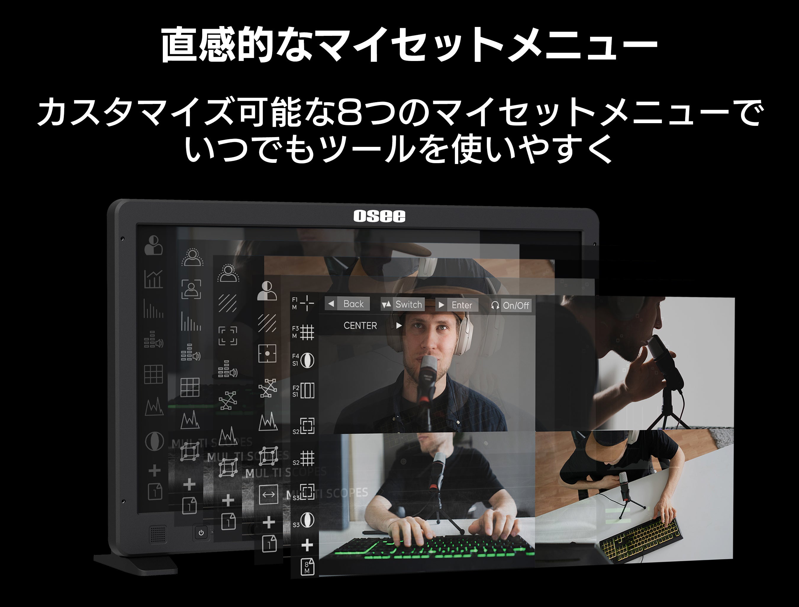 フレーミング、露出、フォーカスチェック、ウィンドウのレイアウトなどシーンごとに使いやすい設定を、カスタマイズ可能な「Mysets(マイセット)」を8種類設定できます。なお、ウィンドウレイアウトの設定は、”MySet8”でのみ可能です。異なるマイセット間の切り替えやツールバーの表示、シングルソース表示でのズームなどをモニター前面のジョイスティックで簡単に操作でき、撮影中にメニューを探す必要がありません。